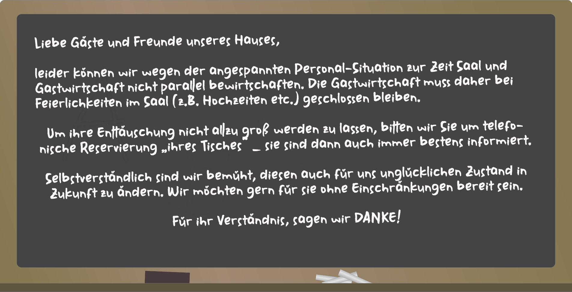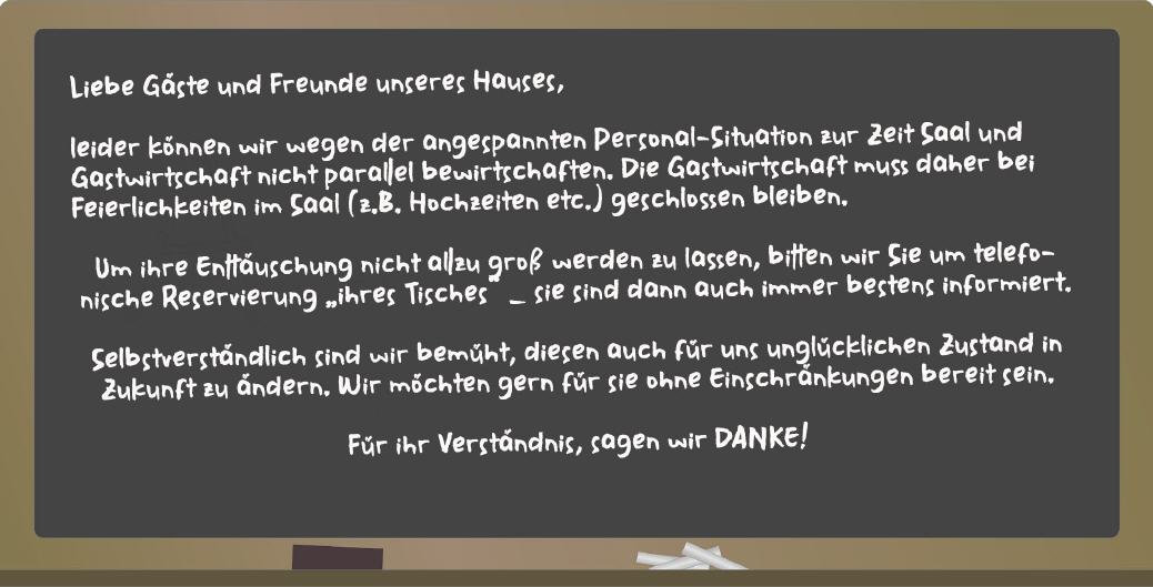 Liebe Gäste und Freunde unseres Hauses, wir freuen uns darüber, Sie in Gaststube, Restaurant, Biergarten (Sommer – gutes Wetter vorausgesetzt) und auch im Saal begrüßen zu dürfen.
